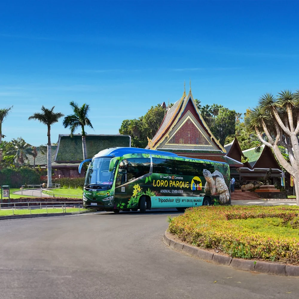 Servicio de bus desde el sur de la isla a Loro Parque. Llegada al parque a partir de las 10:00h y regreso al sur a las 16:30h. En la sección Organiza tu visita puedes consultar horario y rutas.